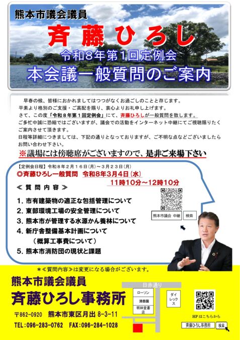 2026年2月25日 / 最終更新日時 : 2026年2月25日 斉藤ひろし 後援会事務所 議会 3月4日 一般質問いたします! 現在、2月16日~3月23日の日程で「令和8年第1回定例会」が開催されております。つきましては、3月4日(水)午前11時10分~12時10分 斉藤ひろしの一般質問がインターネットで生中継されますので、是非ご視聴ください。 熊本市議会一般質問インターネット中継 Bluesky